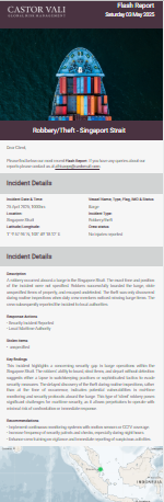 Castor Vali flash report regarding Robbery/ theft at Singapore Strait.