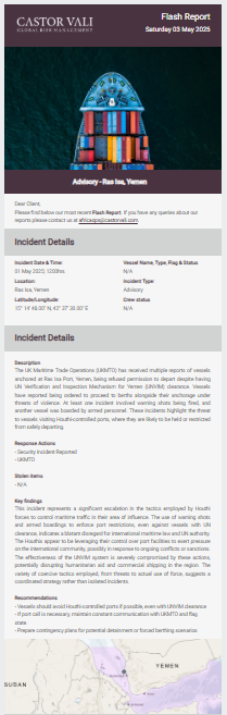 Castor Vali flash report regarding an advisory at Ras Isa, Yemen.