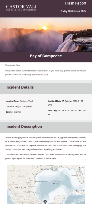 Castor Vali flash report regarding Robbery/Theft at Bay of Campeche.