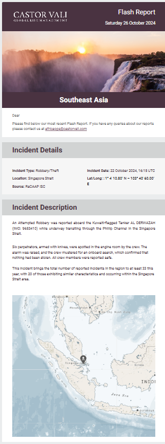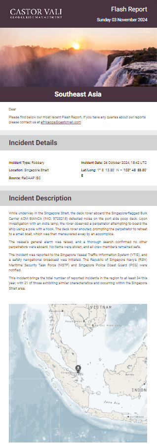 Castor Vali flash report regarding Robbery at the Singapore Strait.