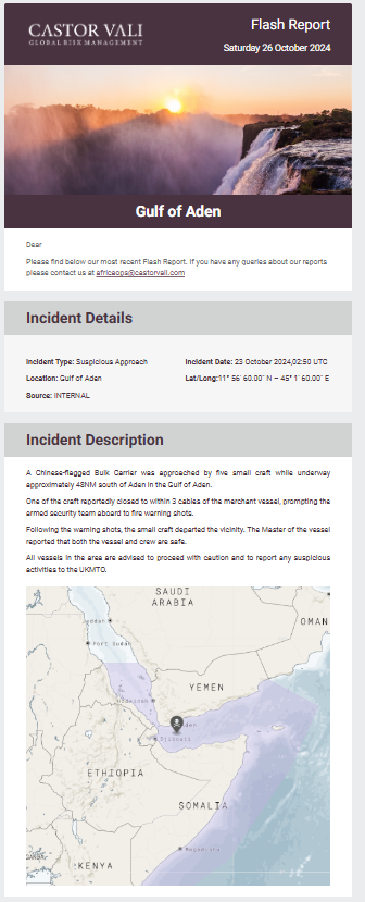 Castor Vali flash report regarding Suspicious Approach at the Gulf of Aden.