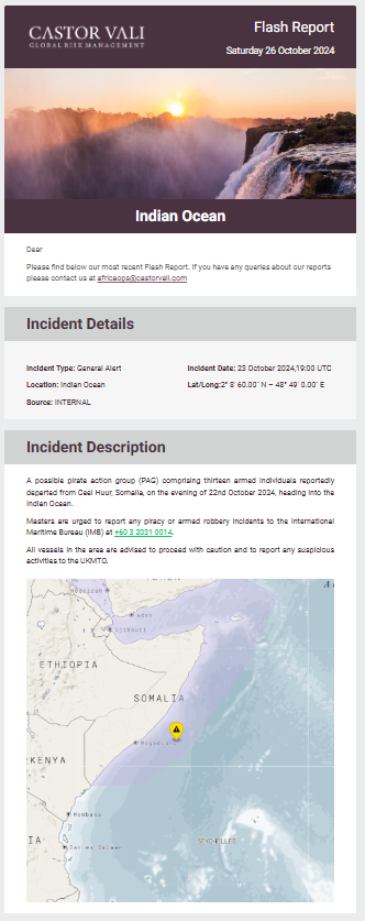 Castor Vali flash report regarding General Alert at the Indian Ocean.