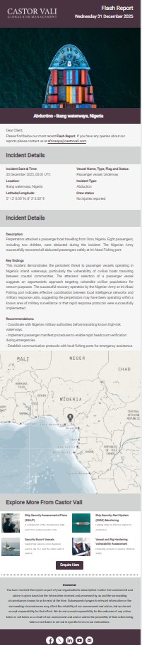 Castor Vali flash report regarding Perpetrators attacked a passenger boat travelling from Oron, Nigeria. Eight passengers, including two children, were abducted during the incident. The Nigerian Army successfully recovered all abducted passengers safely at Ini-Abasi Fishing port.