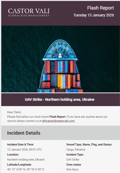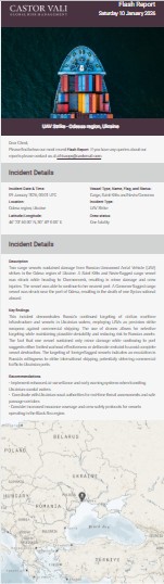 Castor Vali flash report regarding unmanned aerial vehicle (UAV) attack targeted Chornomorsk and Pivdennyi ports in Ukraine.