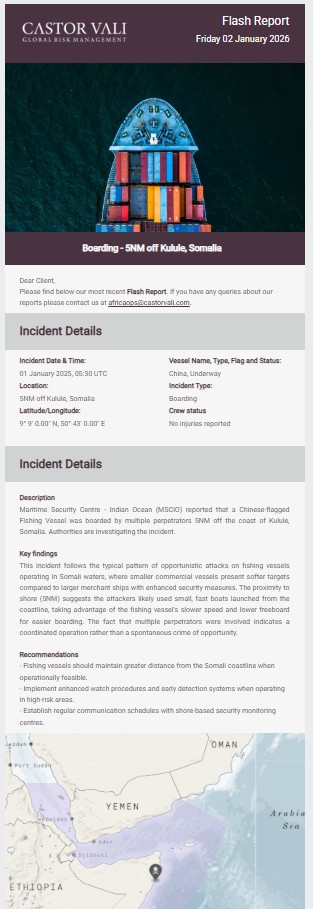 Castor Vali flash report regarding Boarding – 5NM off Kulule, Somalia