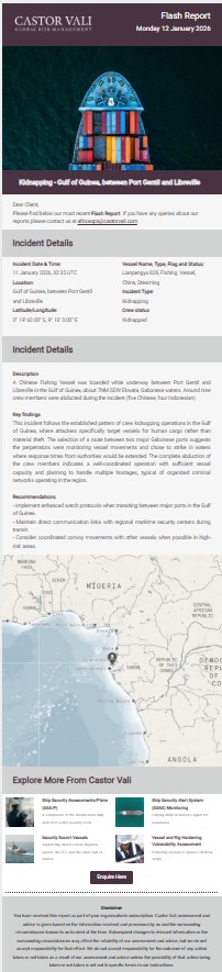Castor Vali flash report regarding a Chinese Fishing Vessel that was boarded while underway between Port Gentil and Libreville in the Gulf of Guinea, about 7NM SSW Ekwata, Gabonese waters.