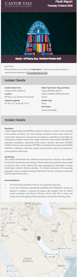 Castor Vali flash report regarding an attack at Northern Arabian Gulf.