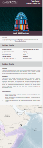 Castor Vali flash report regarding an attack at Salalah Port, Oman.