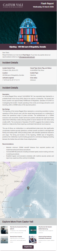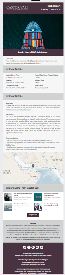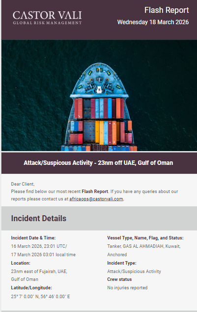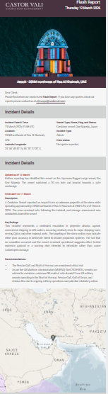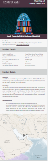 Castor Vali flash report regarding an attack update at 25NM northwest of Ras Al Khaimah, UAE.