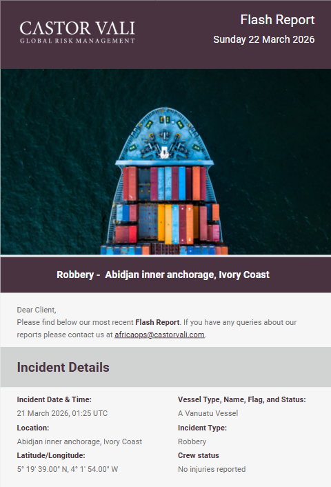 Castor Vali flash report regarding a robbery in Abidjan inner anchorage, Ivory Coast.