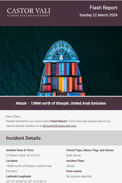 Castor Vali flash report regarding an attack in 15NM north of Sharjah, United Arab Emirates.