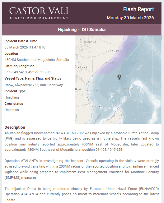 Castor Vali flash report regarding a Hijacking in 480NM Southeast of Mogadishu, Somalia