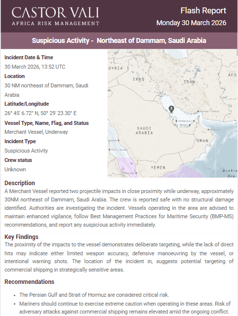 Castor Vali flash report regarding suspicious activity in Northeast of Dammam, Saudi Arabia.