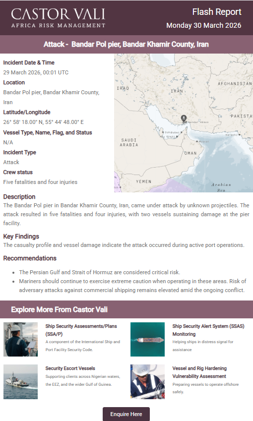 Castor Vali flash report regarding an attack – Bandar Pol pier, Bandar Khamir County, Iran