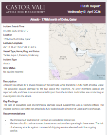 Castor Vali flash report regarding an attack at 17NM north of Doha, Qatar .