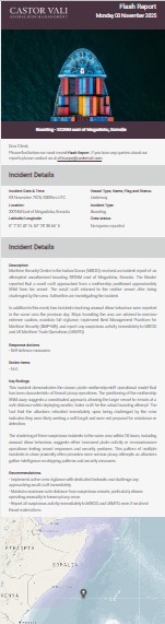 Castor Vali flash report regarding Piracy – 711NM east of Mogadishu, Somalia.