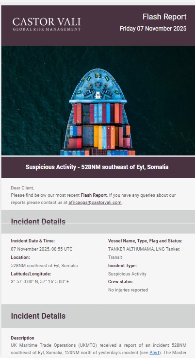 Castor Vali flash report regarding Suspicious Activity – 528NM southeast of Eyl, Somalia.