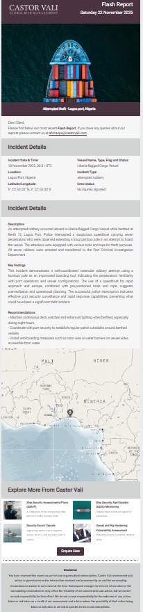 Castor Vali flash report regarding an attempted robbery occurred aboard a Liberia-flagged Cargo Vessel while berthed at Berth 12, Lagos Port.