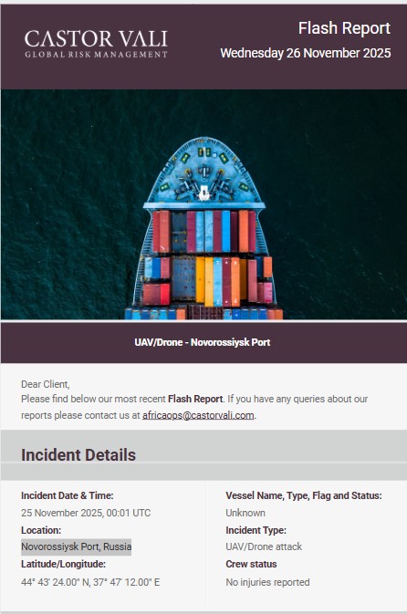 Castor Vali flash report regarding a UAV/Drone occurred in Novorossiysk Port, Russia.